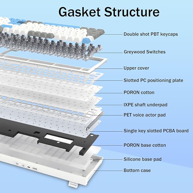 - Gasket Structure and PCB Single Key Slotting: This computer keyboard features a gasket structure, extended integrated silicone pad, and PCB single key slotting, better optimizes resilience and stability, making the hand feel softer and more elastic. Five layers of filling silencer fills the gap between the PCB, the positioning plate and the shaft,effectively counteracting the cavity noise sound of the shaft hitting the positioning plate, and providing a solid feel