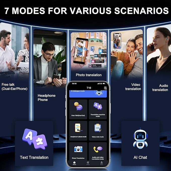 - 【Multiple Translation Modes & No Subscription Fee】 Our ai translation earbuds real time provide AI Translation Interplay Mode, including Call & Video Translation Mode, Free Talk Mode, Voice Note Mode, Translation Machine Mode, Headphone + Phone Mode, and AI Chat (with ChatGPT). Meanwhile, our app is always free and compatible with iOS and Android