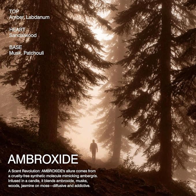 - A Scent Revolution: AMBROXIDE's allure comes from a cruelty-free synthetic molecule mimicking ambergris. Infused in a candle, it blends ambroxide, musks, woods, jasmine on moss—diffusive and addictive.