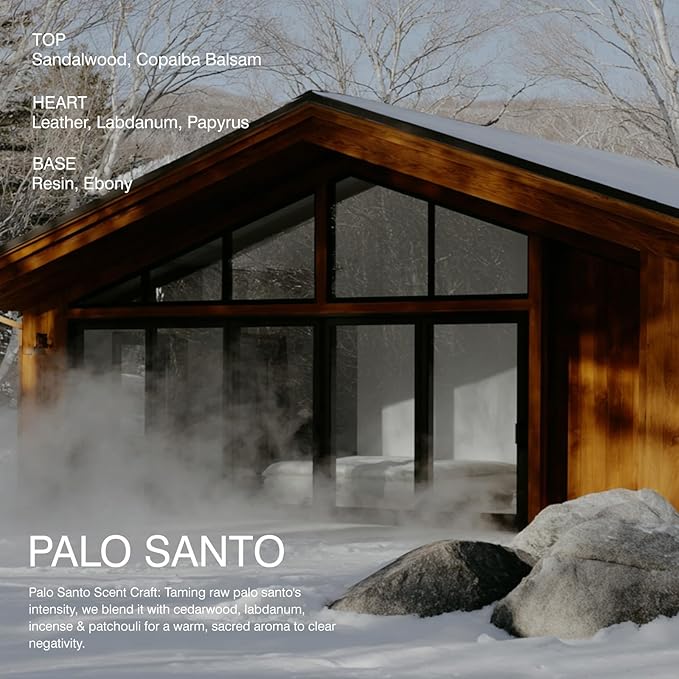 - Palo Santo Scent Craft: Taming raw palo santo's intensity, we blend it with cedarwood, labdanum, incense & patchouli for a warm, sacred aroma to clear negativity.