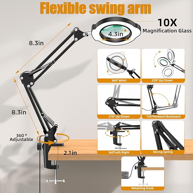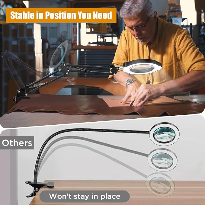 - 【Military-grade support system】The magnifying glasses for close work features a High-strength metal skeleton with 4-spring composite structure, realizing 360°accurate positioning and zero-sag stability. Patented quick release fixture supports 2.1 inch (53mm) thickness desktop installation, ±0.1mm positioning accuracy to meet the needs of electronic maintenance and other precision operations.