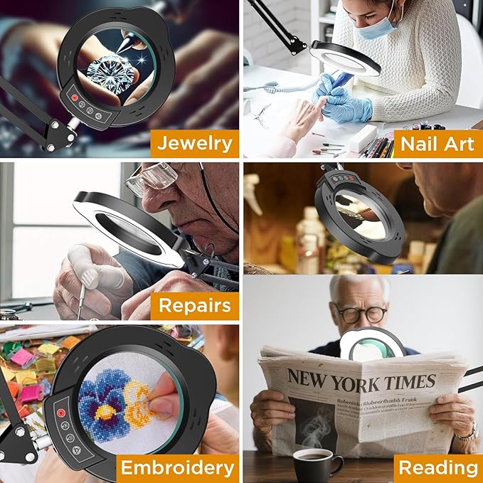 - 【Professional Lighting Solution】The magnifying glass for reading uses an array of 72 professional-grade LED lamp beads, providing 1200Lux uniform illumination. 5 preset light colors + stepped dimming with 360° adjustable bracket, intelligent memory function automatically saves the preference settings, reducing visual fatigue by 50%.