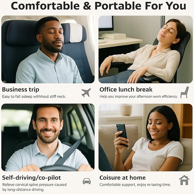 - 【Travel Neck Pillow】 Our travel pillow provides proper support, making you healthier when resting, riding and sleeping. It can relieve neck, shoulder and back pain caused by riding in cars and planes. Let you fall asleep easily on various types of chairs and sofas