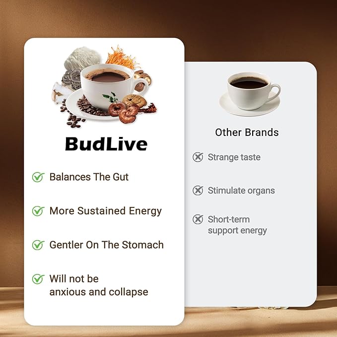 - A Healthier Morning Ritual: Kickstart your day with BudLive Mushroom Coffee for a smooth, energizing boost. Packed with adaptogenic mushrooms, it supports your health goals while satisfying your coffee cravings. (Note: Avoid if experiencing gastrointestinal discomfort.)
