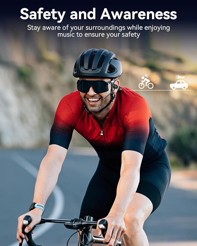 - Open Ear Headphones Design: The Bluetooth headset features an innovative open design, seamlessly integrating this design with a high-quality microphone to ensure both crystal-clear calls and exceptional wearing comfort. This open ear design not only enhances comfort but also allows you to stay aware of your surroundings, improving safety during use, whether you're commuting, working, meeting, or enjoying outdoor activities.