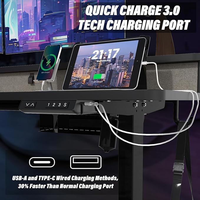 - FASTER CHARGING PORT: The main desktop features a flush-mounted power strip with two power outlets and two USB charging ports (USB-A and Type-C). With ETL and FCC certifications, you can enjoy a reliable power supply right on the desktop to charge phones, headsets, and other devices
