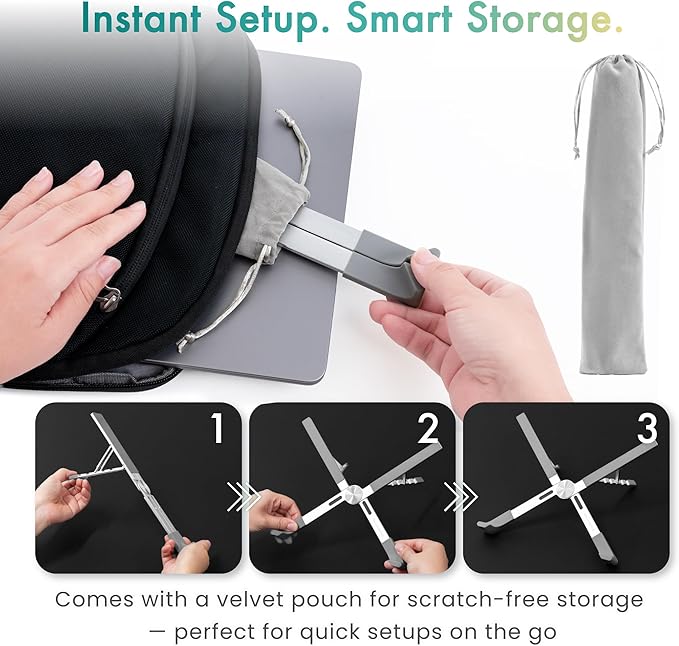 - 🧳Compact & Travel-Ready Folds flat and fits into the included carry pouch. This travel laptop stand is portable, lightweight, and perfect for work anywhere.