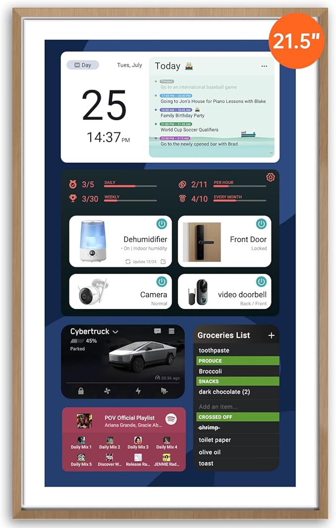 - Smart Photo Frame & Live Screensaver — The 21.5" HD touchscreen eCalendar displays memories from Google Photos and more, seamlessly, no subscription required. Personalize with videos, schedules, clocks, or a mix. Auto Brightness adapts, Sleep Mode saves energy. Climate Pledge Friendly. Beautiful faux wood frame for wall use.