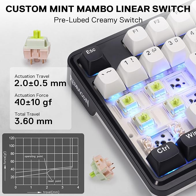 - Custom Mint Mambo Switch - With thick-lubed custom linear switches combo with a gasket form factor, K745 PRO features cushioned rich linear travel with silky creamy and cozy typing feedback. The brand new upgraded socket is nearly all switches(3/5 pins) compatible