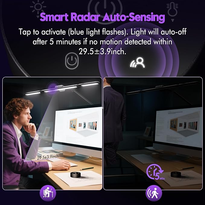 - Seamless Start with Smart Radar Sensing: Begin working the moment you sit down. The sensitive radar sensor detects motion within 29.5±3.9 inches of the monitor light bar, automatically turning it on as you sit and off as you leave after 5 minutes. Perfect for those who move between tasks or step away often, keeping your workspace efficient and distraction-free. Save energy, with intelligence that works alongside you.