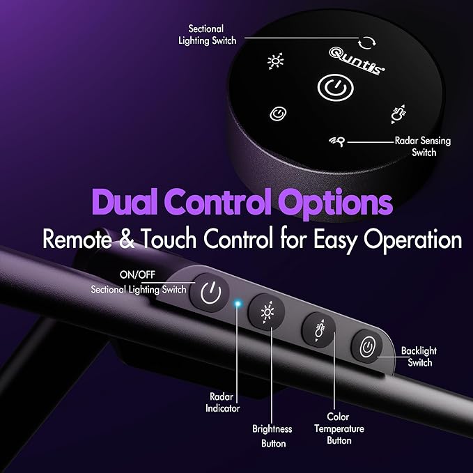 Quntis 32.5" Architect Desk Lamps for Office Home Dorm - Eye Care 3 Light Bar 1100LM Bright, Ambient Backlight, Radar Sensor, Remote Control, 2H Timer, Workbench Drafting Reading Video Conference Task