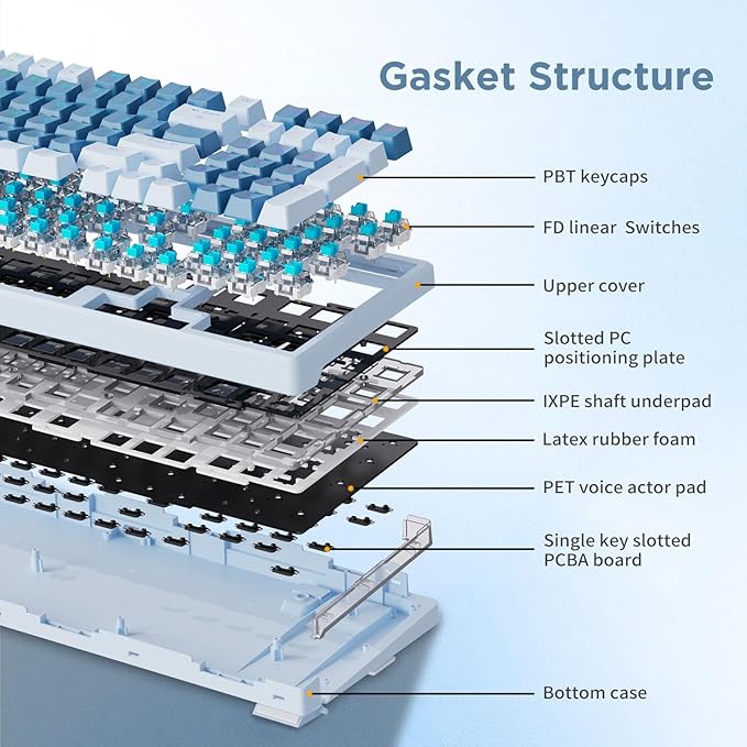- ใ๐๐ฎ๐๐ธ๐ฒ๐ ๐ฆ๐๐ฟ๐๐ฐ๐๐๐ฟ๐ฒ & ๐ฃ๐๐ ๐ฆ๐ถ๐ป๐ด๐น๐ฒ ๐๐ฒ๐ ๐ฆ๐น๐ผ๐๐๐ถ๐ป๐ดใThis computer keyboard features a gasket structure, extended integrated silicone pad, and PCB single key slotting, better optimizes resilience and stability, making the hand feel softer and more elastic. Four layers of filling silencer fills the gap between the PCB, the positioning plate and the shaft,effectively counteracting the cavity noise sound of the shaft hitting the positioning plate, and providing a solid feel.
