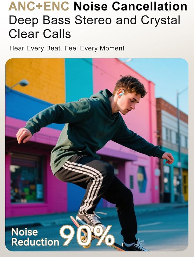 - Pro-Grade Dual-Mode Noise Cancellation: Our noise cancelling earbuds feature Adaptive ANC that optimizes ambient noise for a more immersive listening experience. During calls, ENC technology instantly kicks in, isolating your voice and reducing background noise so you can enjoy clear conversations anytime.