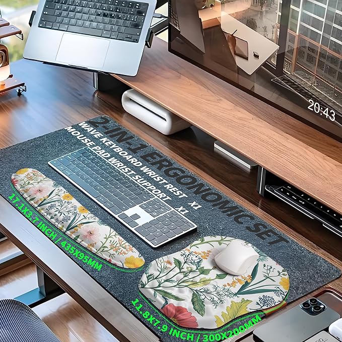 - 【Ergonomic Set】Wave Keyboard Wrist Rest x1(17.1x3.7 inch, 435x95mm) and Massage Slope Mouse Pad Wrist Support x1(11.8x7.9 inch, 300x200mm), ergonomic curvature design optimization, more in line with the natural position of the shoulder during work, alleviates carpal tunnel syndrome and wrist pain