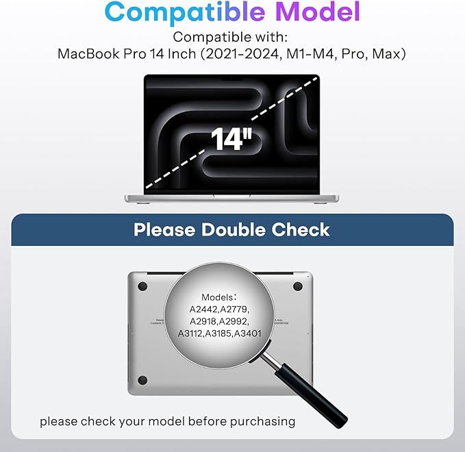 - Compatible Devices:OMOTON magnetic MacBook privacy screen is specially designed to fit the MacBook Pro 14 Inch (2021-2024, M1-M4, Pro, Max). Not compatible with other MacBook models.(Model:A2442,A2779,A2918A2992,A3112,A3185,A3401)