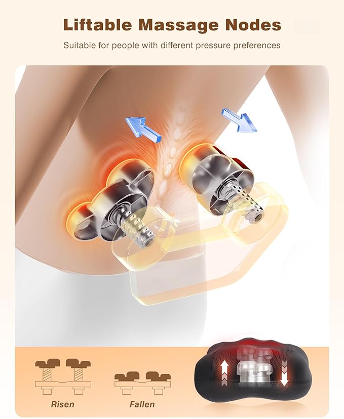 - 【2-in-1 Back Massager with Liftable Nodes】This 2025 upgraded 2-in-1 cordless shiatsu back massager features liftable 4D massage nodes that rise and fall to target your upper back, lower back and lumbar. Dual-sided heating and deep-tissue kneading deliver a soothing, comfortable massage experience.