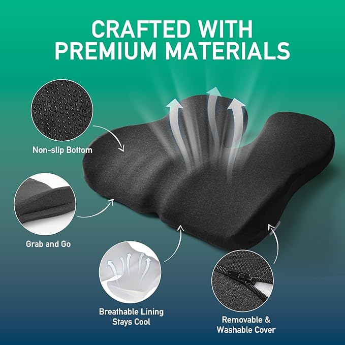 - ๐๐ซ๐ ๐จ๐ง๐จ๐ฆ๐ข๐ ๐๐๐ฌ๐ข๐ ๐ง ๐๐จ๐ซ ๐๐๐ฑ๐ข๐ฆ๐ฎ๐ฆ ๐๐จ๐ฆ๐๐จ๐ซ๐ญ ๐๐ง๐ ๐๐ฎ๐ฉ๐ฉ๐จ๐ซ๐ญ๏ผOur premium memory foam seat cushion features an ergonomic design that provides exceptional support to your tailbone, hips, and lower back. The cushion is designed with a unique multi-layer construction: the top layer offers immediate comfort, while the middle layer provides firm support that wonโt flatten over time, even after prolonged use, ensuring lasting comfort.