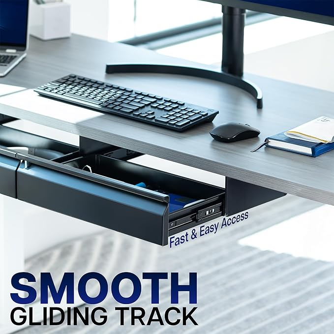 - Under Desk Storage: Sturdy steel drawers (16" each) mount to the underside of your desk (at least 3/4" thick) and provide extra storage space for decluttering your area in style. Designed to fit both standing desks and standard fixed-height workstations