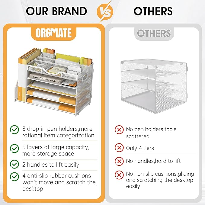 - User Friendly-2 round wrap-around handles + 4 rubber anti-slip feet, provide you with a comfortable grip at the same time, can make the letter tray organiser is not easy to slide and scratch the desktop, to protect the surface of the desktop. Perfect as a file organizer for desk or document organizer, it fits seamlessly into compact workspaces or classroom organization setups