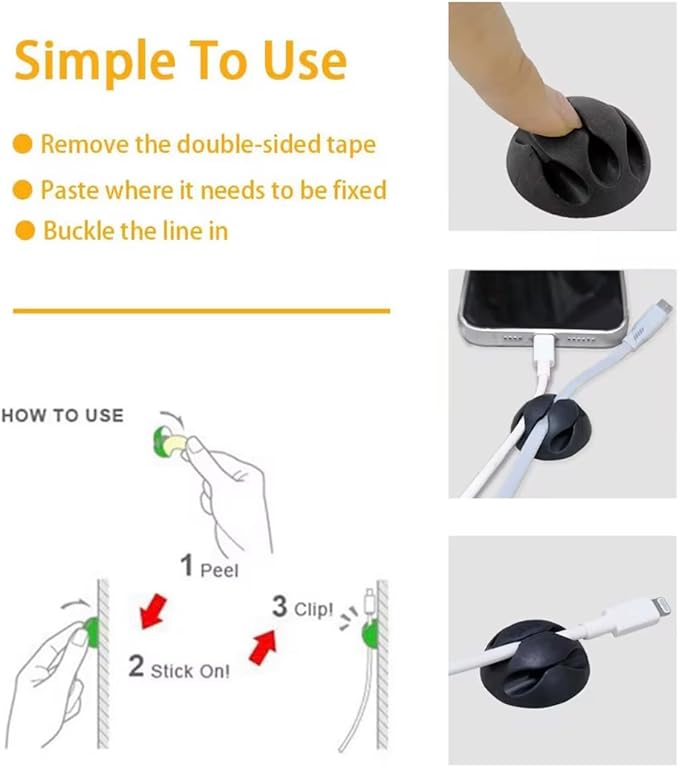 - Strong Adhesive Backing – Each cable clip comes with powerful adhesive to stick firmly on most surfaces like desks, walls, or nightstands.