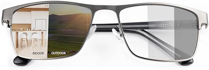 - 【Photochromic Lens】Photochromic Sunglasses lens will change from clear to black in response to the intensity of the ultraviolet, also with high transmittance (93%).Effectively maintain a suitable brightness to protect your eyes in strong sunshine.The darkness of lens color depends on UV intensity!Indoors, you can wear it as anti-blue light glasses: Filter high level blue light from digital screen of computer, phone and TV.Outdoors, you can use it as sunglasses.
