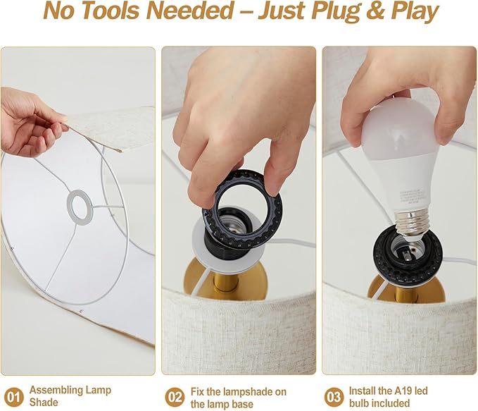 - 2 LED Bulbs Included: The package contains 2 x 9W 3 way dimmable LED bulbs. Energy efficient and stable. No buttons needed, just gently touch the base to cycle through 3 lighting presets. The lamp base of this table lamp is E26 base, you can install any type of LED bulb with E26 base up to 60W for it. The nightstand lamp is also equipped with USB A and Type C charging ports. This bedside lamp can meet the needs of various usage scenes.