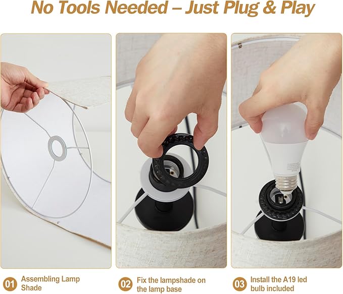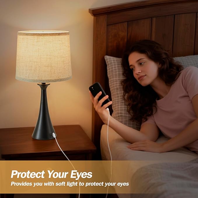 - 2 LED Bulbs Included: The package contains 2 x 9W 3 way dimmable LED bulbs. Energy efficient and stable. No buttons needed, just gently touch the base to cycle through 3 lighting presets. The lamp base of this table lamp is E26 base, you can install any type of LED bulb with E26 base up to 60W for it. The nightstand lamp is also equipped with USB A and Type C charging ports. This bedside lamp can meet the needs of various usage scenes.