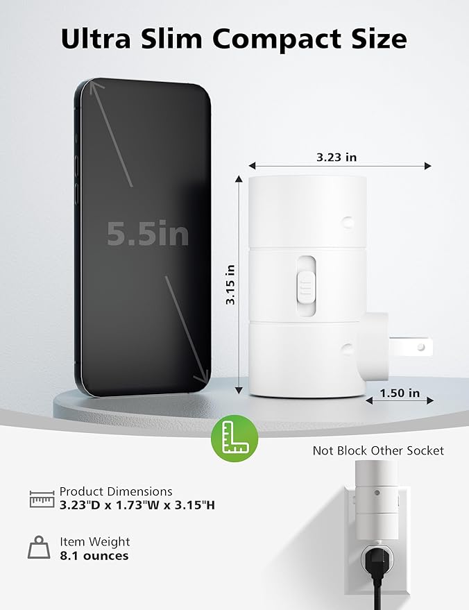 - 【Sleek & Compact Design】Compact offset plug keeps adjacent outlets free,featuring contoured low-profile edges for a wall-hugging fit, the base prevents loose socket grip while modern cylindrical look enhances home aesthetics.