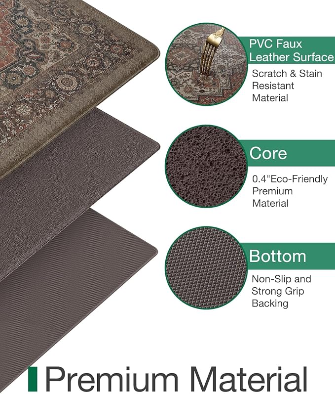 - Fatigue Relief Design: LUMI anti fatigue kitchen rug with 0.4" cushioned memory foam offers better support for feet,, knees, legs, and back.When you need to stand at the sink, in the laundry area or beside your desk, this perfect fatigue kitchen mat is a better choice