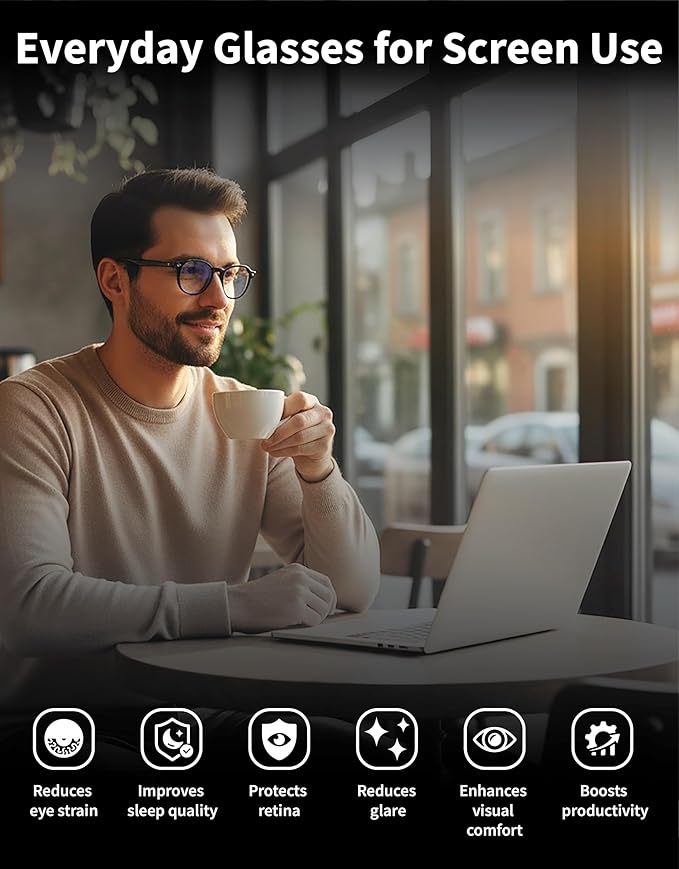 - REDUCE EYE STRAIN ON SCREENS – Filters 77% of harmful blue light (380–450 nm) while keeping text sharp and colors true. Ideal computer glasses for reading documents, coding, or browsing on phones, tablets, and laptops.