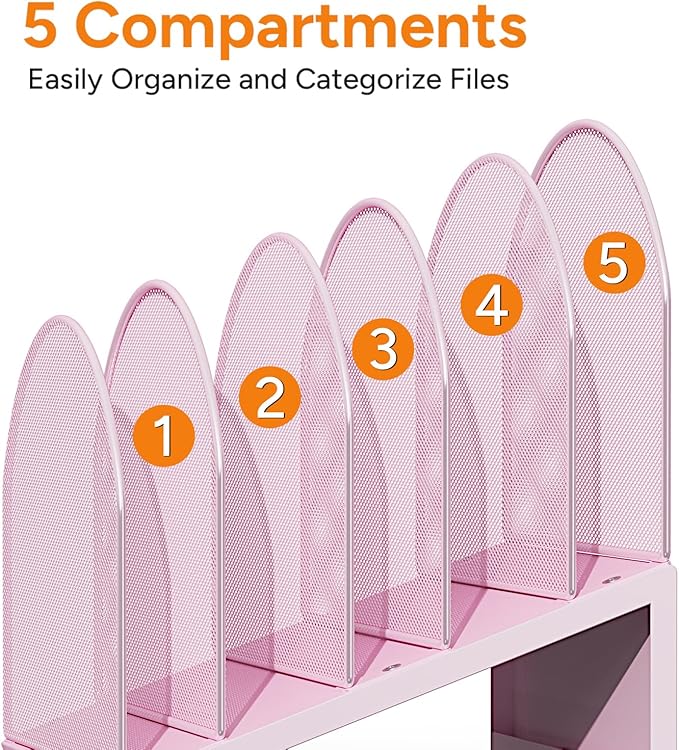 5-Section Desk File Organizer, Metal Mesh Folder Organizer for Documents, Mail & Office Papers (Pink)