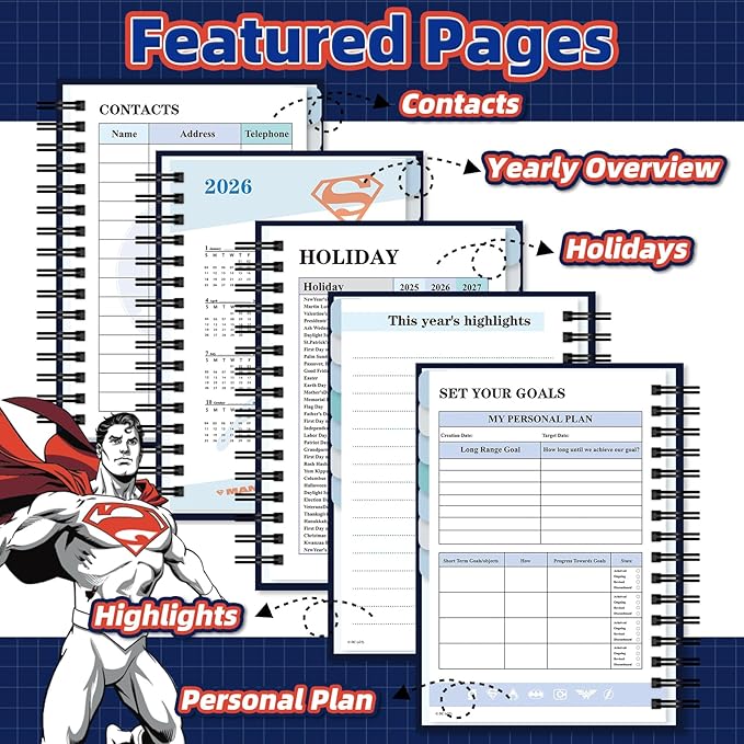 - 【Stylish, Functional & Superhero-Inspired】This superhero-themed spiral-bound planner is the perfect choice for students, professionals, or anyone who prefers handwritten notes. The notebook's design features a unique superhero aesthetic, making it an inspiring gift for work, school, or even as a fun tool for staying organized. It’s the ideal blend of work and play.