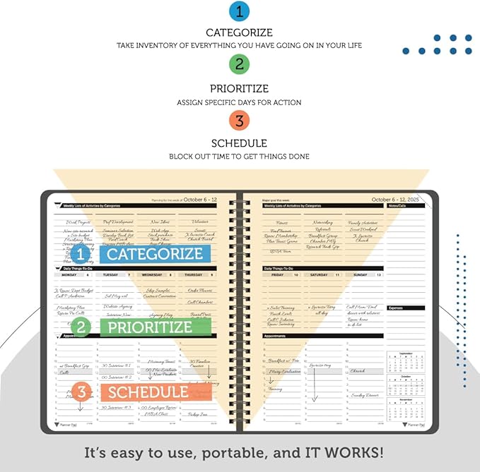 - EXCLUSIVE 3-TIER FUNNEL DOWN approach helps you prioritize and organize all that matters. Section 1- CATEGORIZE is to inventory everything you have going on. Section 2 - PRIORITIZE items from section 1 to specific days for attention. Section 3 - SCHEDULE is to block out time for tasks from section 2