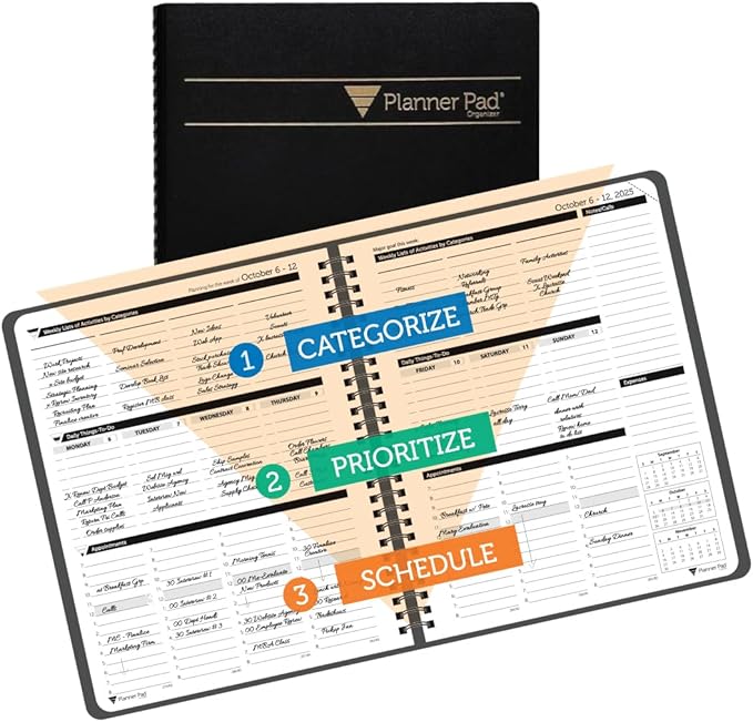 Planner Pad Spiral Bound 3-Tier Funnel Down 12 Month Organizer, October 2025 – September 2026, Black Cover/Black Ink, 6 3/4" x 8 1/2"
