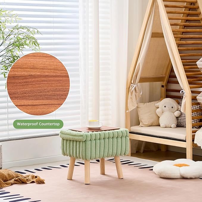 Wimarsbon Storage Ottoman,Soft Faux fur Footstool with Padded Seat, Small Reading Vanity Chair, Footrest with Wood Tray for Couch, Mini Coffee Table or Display Stand (Light Green, Rectangular Storage)