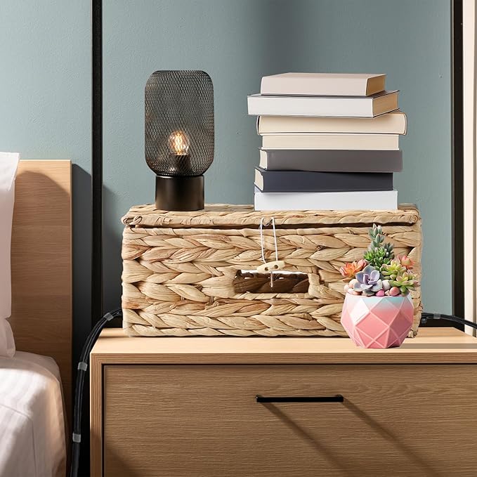 2 Pack Cable Management Box with Lid, Handwoven Water Hyacinth Cord Organizer, 4 Side Open Slots Cable Hider for Power Strips, Cords & Wires, Desk/Floor/Office Storage Box to Hide Electronics Clutter