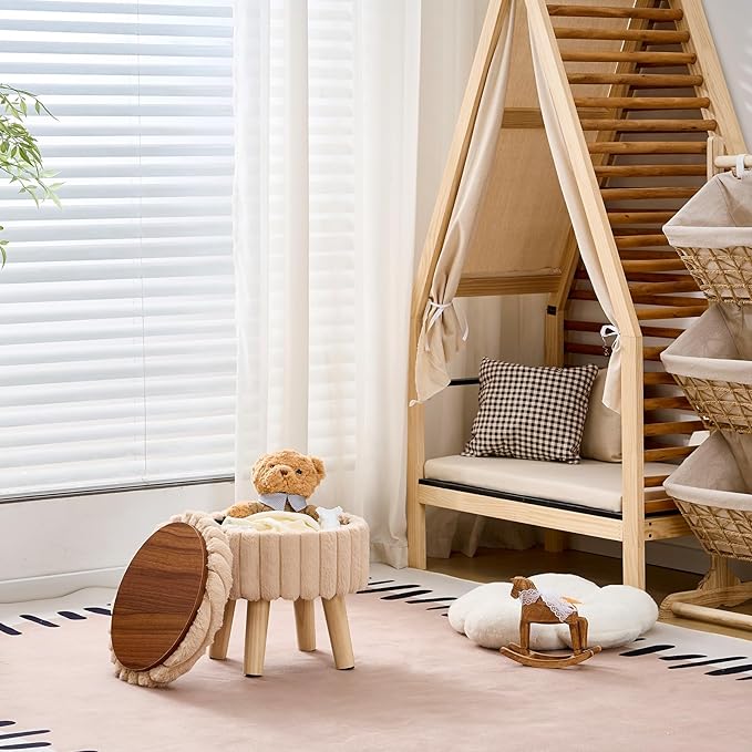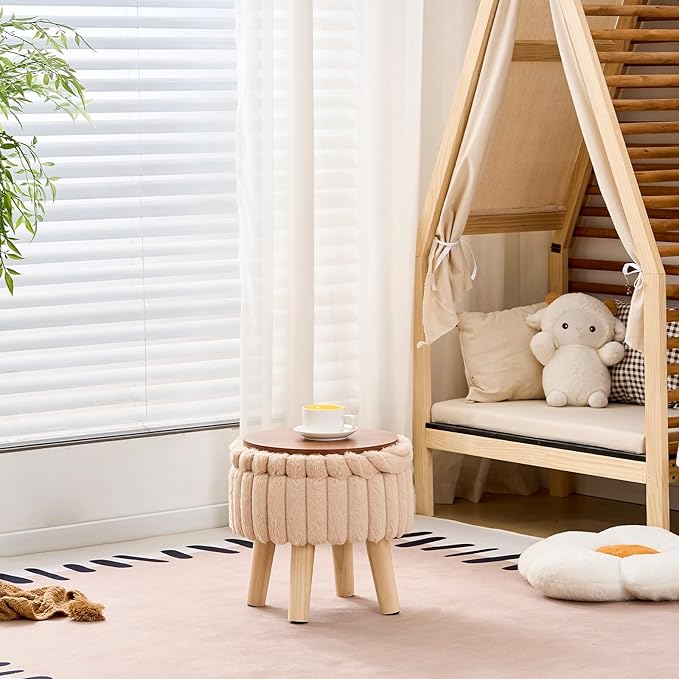 Wimarsbon Storage Ottoman,Soft Faux Fur Footstool with Padded Seat, Small Reading Vanity Chair, Footrest with Wood Tray for Couch, Mini Coffee Table or Display Stand (Beige, Round Storage)