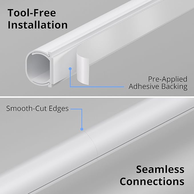 - 142in Wire Hiders for TV on Wall: Includes 10 x 14.2in cord covers (total 142in). Smooth edges connect seamlessly - no ugly connectors. Pre-applied strong adhesive - no screws needed, simply peel and stick for quick, tool-free installation. (Tape not suitable for textured walls)