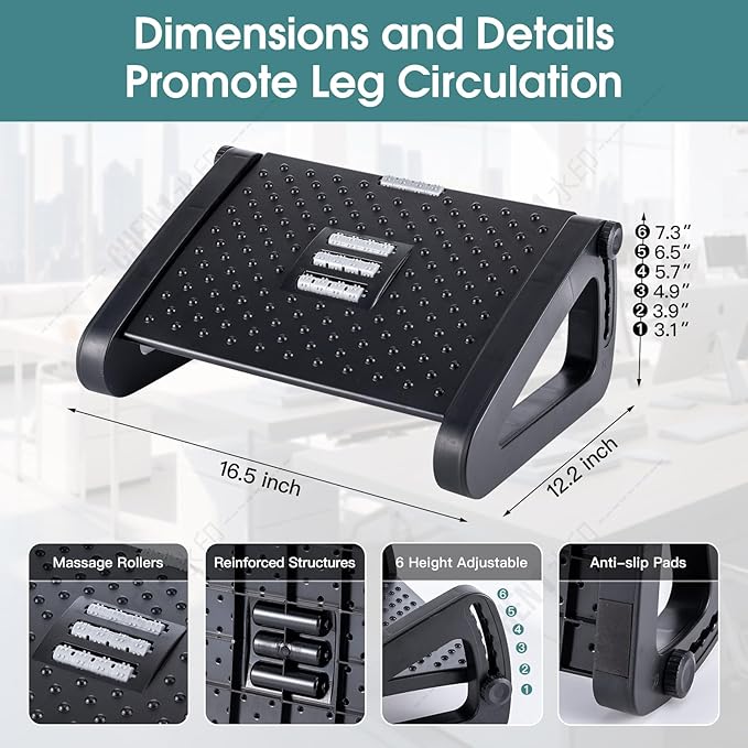 - Under Desk Foot Massager: Our feet rest for under desk features a small-particle massage surface and four massage rollers. While working, place your feet on the foot rests under your desk and roll the rollers. It can not only massage the soles of the feet but also promote blood circulation and completely relax the legs.