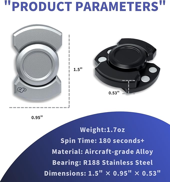 - Three Ways to Fidget, Endless Fun: Click Mode (Satisfying mechanical button-like feedback),slide Mode ( Smooth gear-turning tactile sensation),Spin Mode (R188-10 ball bearing enables 3-minute spins)