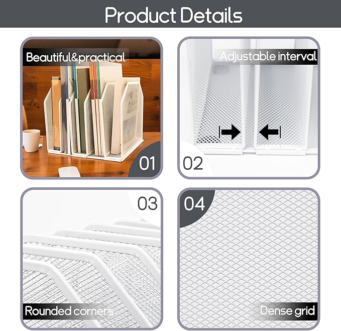 Adjustable Desk File Organizer,Detachable Office Folder Organizer,Compact Vertical Desk File Holder,Wrought Iron Paint,Suitable for Home, School, Office Classrooms (White - 5 grids)
