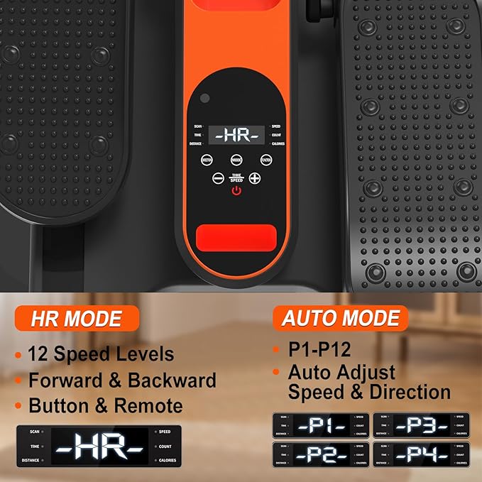 - AUTO & MANUAL MODE: This ellipse leg exerciser provides Auto (P1-P12) & Manual mode(12 speed levels) for your choice. Easily control the speed and intensity of your workout using the remote control. Pedals can move forward or backword to target your different muscle groups, achieve your fitness goals