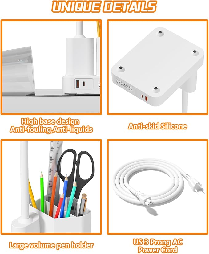 - [ All-in-One Charging Hub & Storage Organizer ] Features USB charging ports + AC outlet to power phones, tablets, or laptops while keeping cords tidy. Built-in pen holder desk lamp design stores stationery and small accessories, creating a clutter-free charging station for home office or dorm desks
