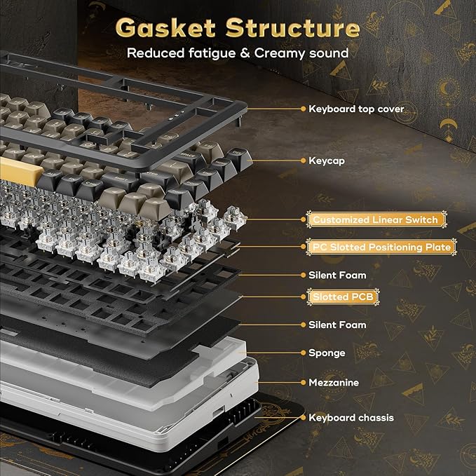 - 【Gasket Structure & PCB Single Key Slotting】The K738 Cream Keyboard uses a gasket structure for both resilience and stability, as well as PCB single-key slotting to better optimize resilience and stability, for a more comfortable feel, softer elasticity, reduced percussive noise, and a purer sound