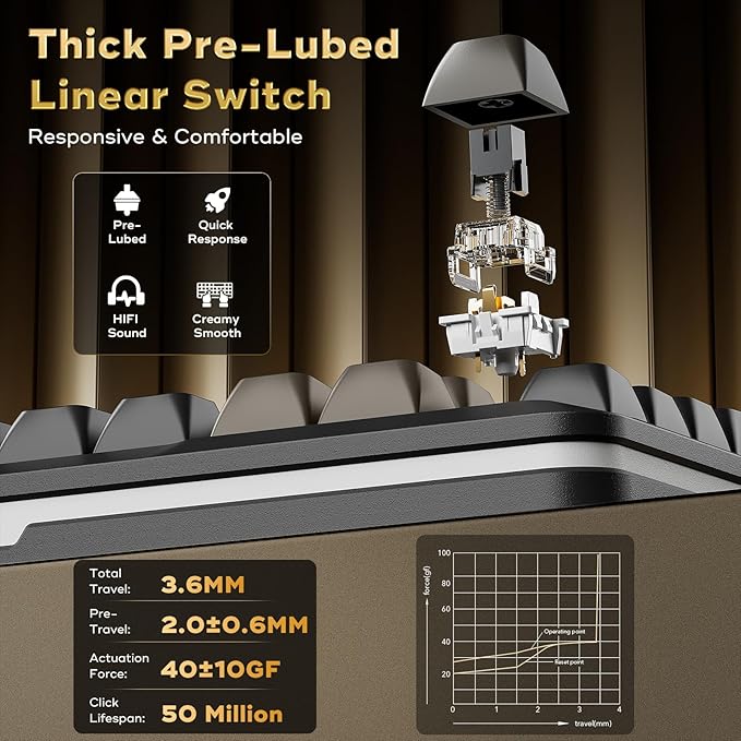 - 【Pre-Lubed Linear Switches & Hot Swap】The compact keyboard adopts pre-lubricated linear switches, which makes the keys smoother, triggers faster and reduces the key noise at the same time; it supports 3/5pin hot-swappable, which makes it convenient for you to change different shafts to meet your personalized needs