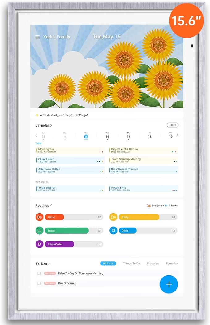 - Smart Photo Frame & Live Screensaver — The 15.6" HD touchscreen eCalendar displays memories from Google Photos and more, seamlessly, no subscription required. Personalize with videos, schedules, clocks, or a mix. Auto Brightness adapts, Sleep Mode saves energy. Climate Pledge Friendly. Beautiful faux wood frame for wall or desktop use.