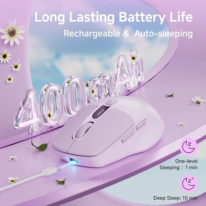 - 【Ergonomic Design & Auto Sleep Mode】: Weighing only 65g, the purple mouse is designed with an ergonomic shape that fits naturally in your hand, reducing wrist strain during extended use (Which is very suited for SMALL to MEDIUM-sized hands). Equipped with intelligent power-saving technology, this computer mouse automatically switches to a low-power state after 1 minute of idling and a full sleep mode after 10 minutes. Simply double-click to wake it from any mode