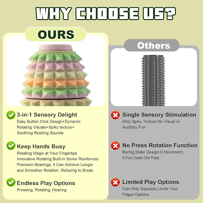 - Triple‑Mode Fidget Play:Combines a satisfying spiky roller, smooth spinner, and responsive clicker buttons in one compact stim toy. This 3‑in‑1 design supports multiple fidgeting styles, helping adults manage restless hands, reduce anxiety, and maintain mental clarity without disturbing others