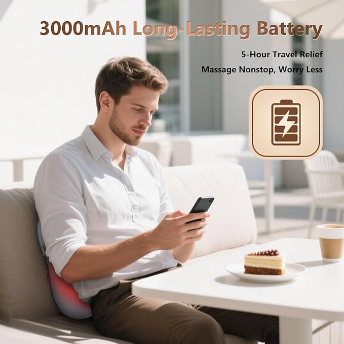 - 【Cordless and Large Capacity 】This back massager with heat features a wireless design with a robust 3000mAh battery, delivering ultimate convenience and freedom of movement. No more tangled cords or anxiety about short usage times - easily bring this shoulder and back massager anywhere. Whether you're recovering from workouts or managing chronic discomfort, it therapeutic kneading and heat therapy provide effective relief for a rejuvenated body.