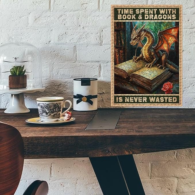 1000 Piece Difficult Wooden Jigsaw Puzzle Spent with Books and Dragons is Never Wasted Adults & Kids Educational Family Game Stress Relief Quiet Play Home Decor 29.5x19.7 Inch